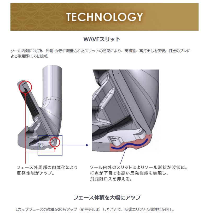 Lカップフェースの体積が20%アップ(前モデル比)したことで、反発エリアと反発性能が向上。